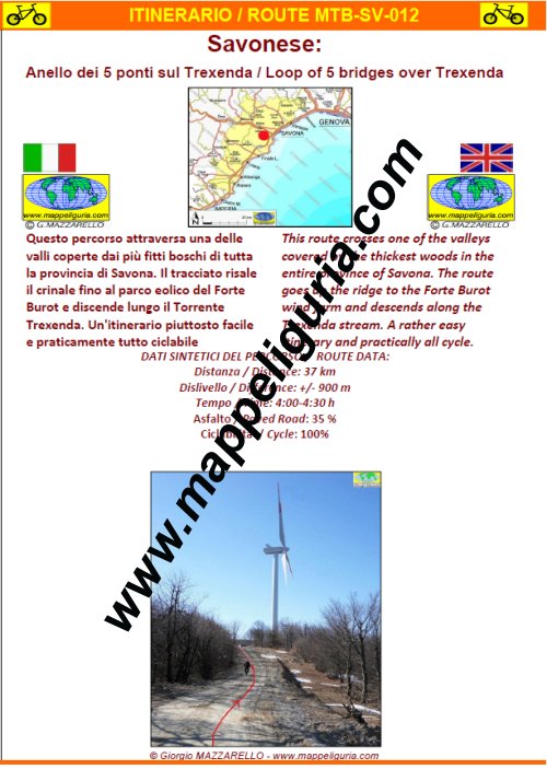 Questo percorso attraversa una delle valli coperte dai più fitti boschi di tutta la provincia di Savona. Il tracciato risale il crinale fino al parco eolico del Forte Burot e discende lungo il Torrente Trexenda. Un'itinerario piuttosto facile e praticamente tutto ciclabile