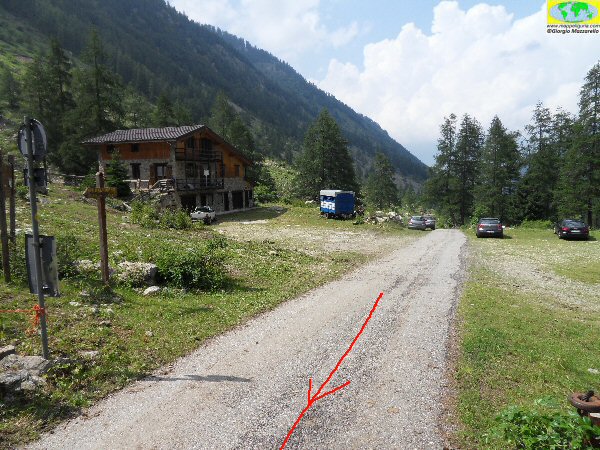 Il bivio dove si lascia la sterrata per salire a DX verso il Lago di Aver Sottano