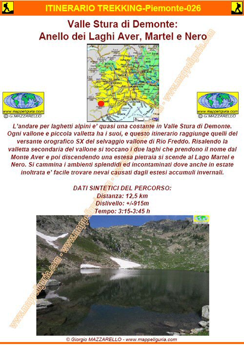 L’andare per laghetti alpini e’ quasi una costante in Valle Stura di Demonte. Ogni vallone e piccola valletta ha i suoi, e questo itinerario raggiunge quelli del versante orografico SX del selvaggio vallone di Rio Freddo. Risalendo la valletta secondaria del vallone si toccano i due laghi che prendono il nome dal Monte Aver e poi discendendo un’estesa pietraia si scende al Lago Martel e Nero. Si cammina in ambienti splendidi ed incontaminati dove anche in estate inoltrata e’ facile trovare nevai residui degli estesi accumuli invernali.