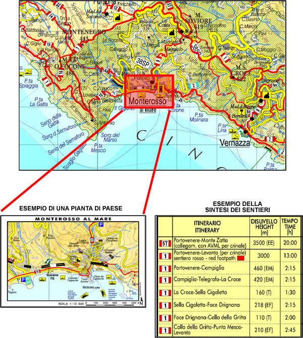 Tutti i borghi delle Cinque terre e del Golfo dei Poeti hanno una breve descrizione ed una piantina dettagliata con evidenziate sia le partenze dei sentieri sia i principali monumenti.